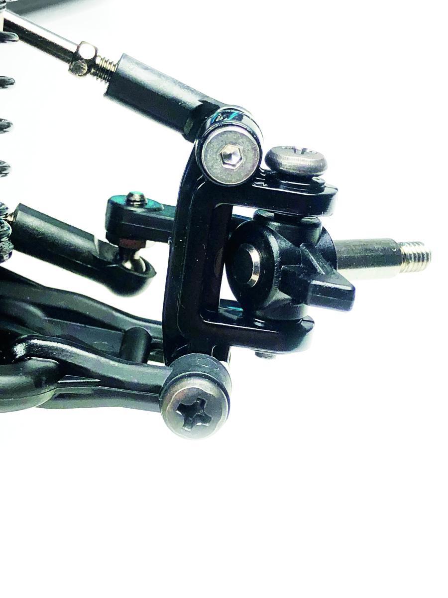 Die neue Vorderachseinheit möchten wir an dieser Stelle mit Bewunderung und Lob an die Designer aus Shizuoka vermerken. In dem recht begrenzten Platz im vorderen Teil der Chassiswanne wurde eine neue Vorderradaufhängung mit Doppelquerlenkern eingepflanzt. Noch dazu wurde eine ausgeklügelte und sechsfach kugelgelagerte Lenkung integriert. Die Achsschenkel und C-Hubs sind wieder dem DT-02-Chassis entliehen und werden mit den einstellbaren Spurstangen am Chassis verbunden. Den oberen Dämpferaufnahmen wurden zusätzliche Verstärkungen spendiert. Auch die CVA-Öldruckstoßdämpfer sind Tamiya-Fans wohlbekannt und beruhigen sicherlich das Fahrverhalten des Hornet-EVO.