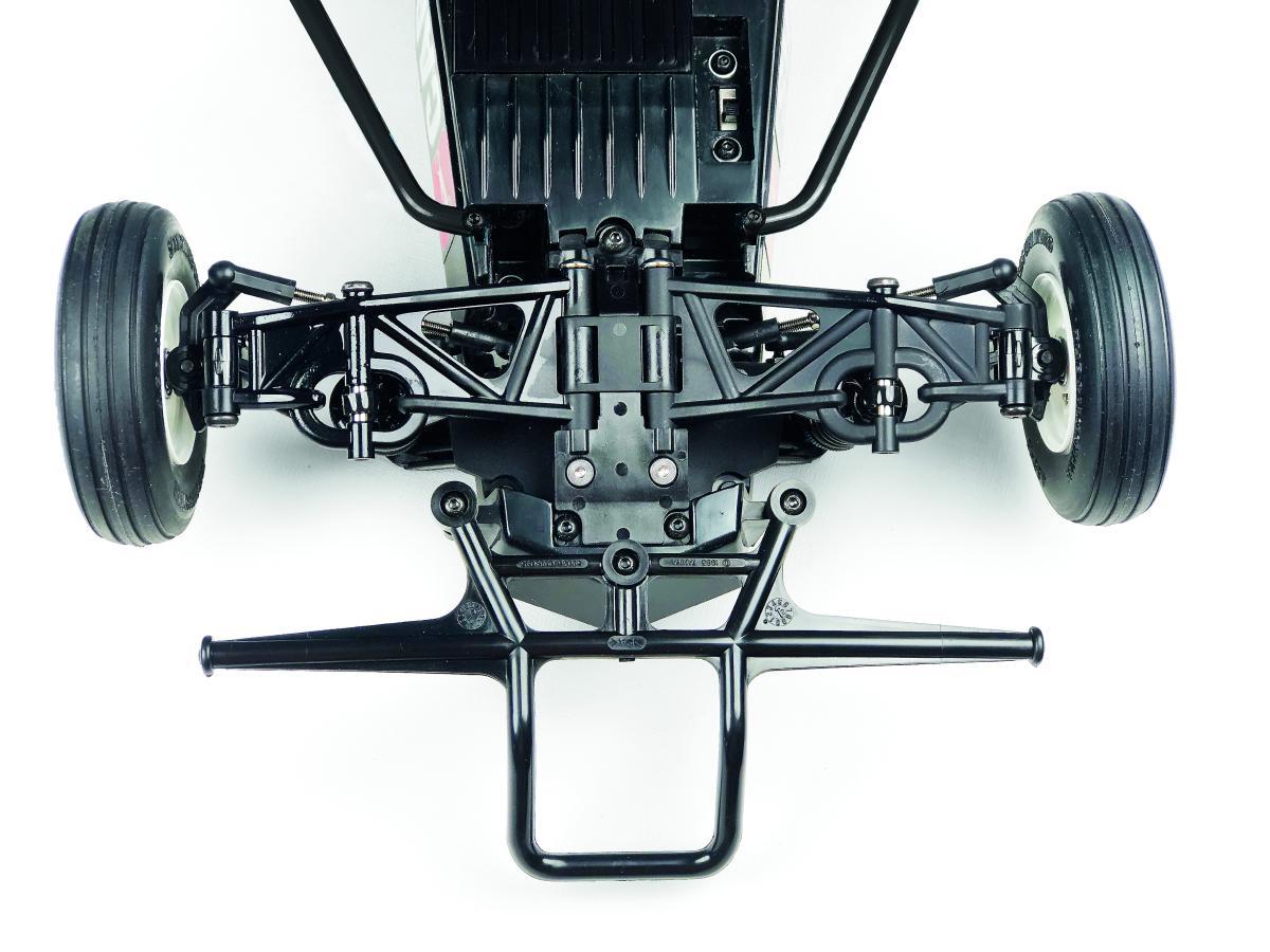 Das Urmodell der Hornet war ein sogenannter 2WD Starrachs-Buggy. An der Hinterachse werkelte eine pendelnd aufgehängte Starrachseinheit und eine einfache Vorderachse, welche beim Einfedern extreme Sturzveränderung hatte. Beim Bausatz des Hornet-EVO wurde alles um die klassische Chassiswanne neu konstruiert. Für Tamiya-Verhältnisse ist die Ausstattung des Kit sehr großzügig. Dem Bausatz liegen vier CVA-Öldruckstoßdämpfer, sieben Spurstangen mit Rechts-/Linksgewinde und 20 Kugellager bei!