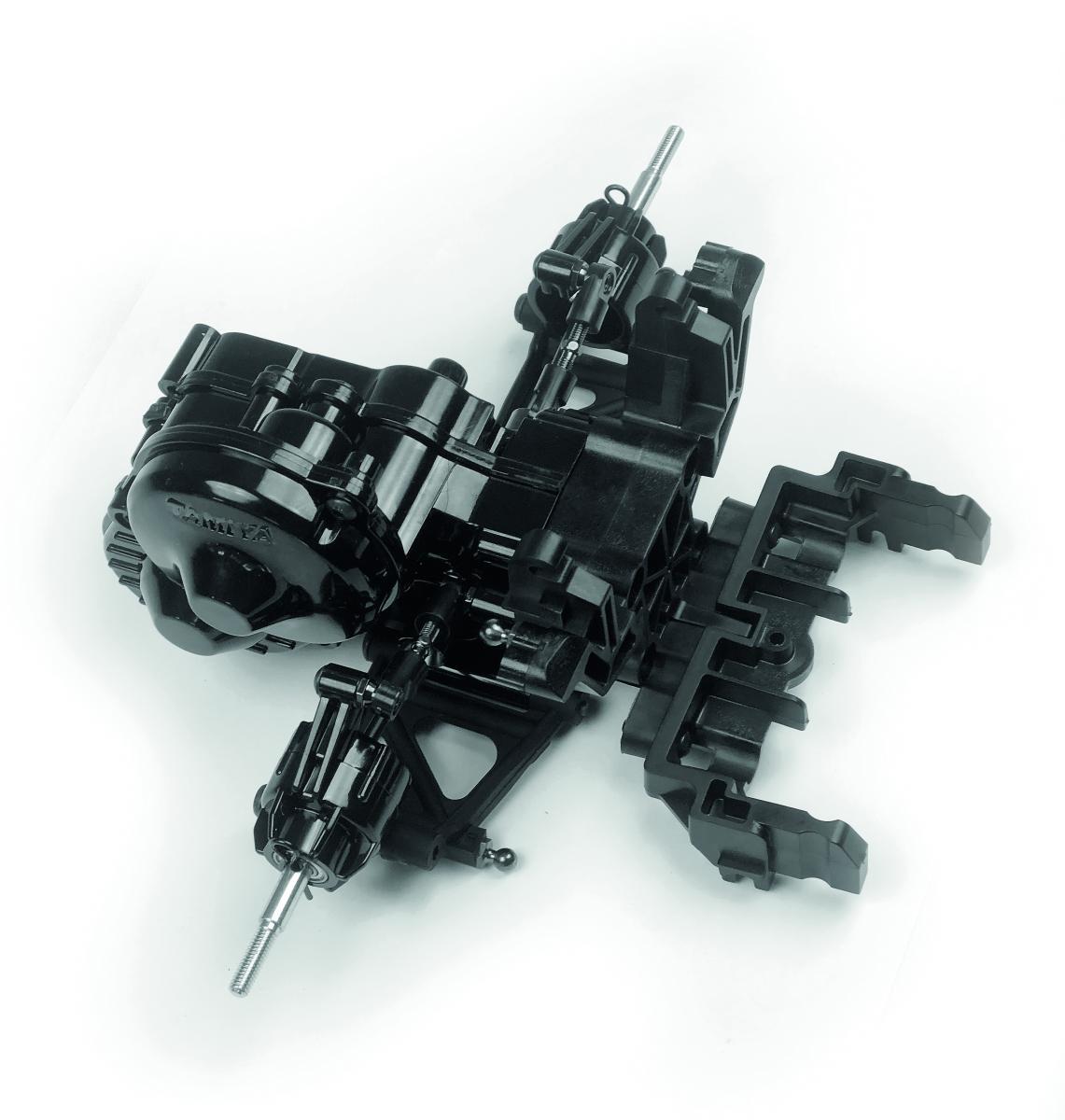 Das komplette Getriebe stammt vom DT-02 Chassis, mit einem robusten Kegeldifferenzial und groß dimensionierten Zahnrädern. Stahlknochen übertragen die Motorkraft an die Räder. Ebenfalls vom DT-02 sind die hinteren Radträger, die aber von neu designten unteren Querlenkern geführt werden. Der Sturz ist hier stufenlos einstellbar. Ebenfalls neu sind drei Rahmenteile, welche die Hinterachseinheit mit der Original-Chassiswanne verbinden.
