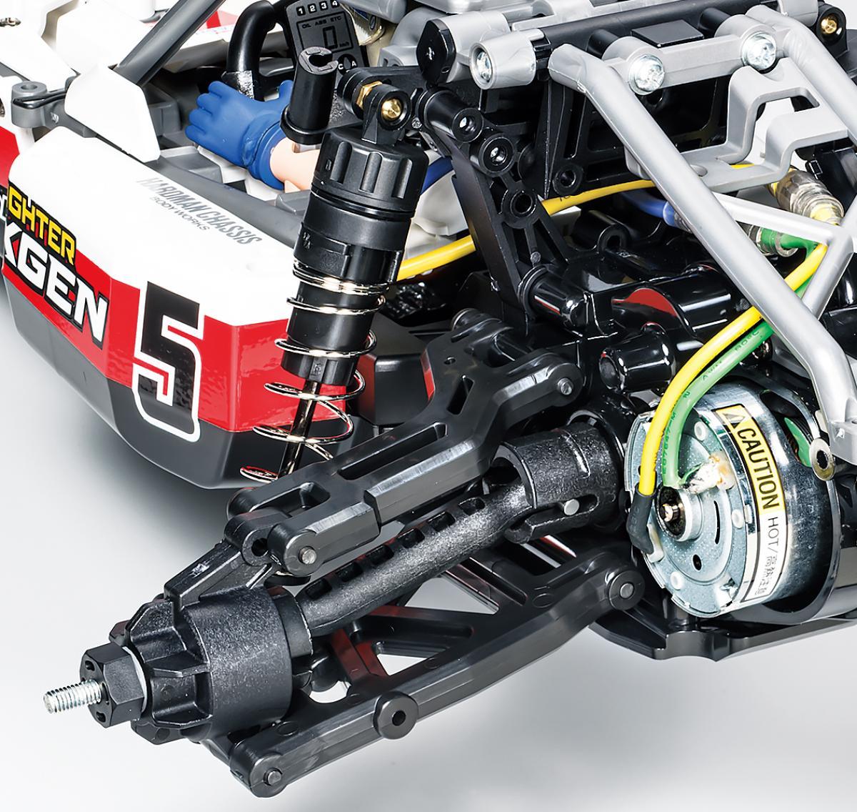 Tamiya has introduced the TRF 104 chassis for racing enthusiasts. The model consists mainly of carbon and aluminum and offers a fully adjustable front axle. The rear axle suspension with aluminum oil pressure shock absorbers, carbon rear axle, ball differential, aluminum engine mount is not only a real gem, but also fully adjustable and not only for the ambitious racer.