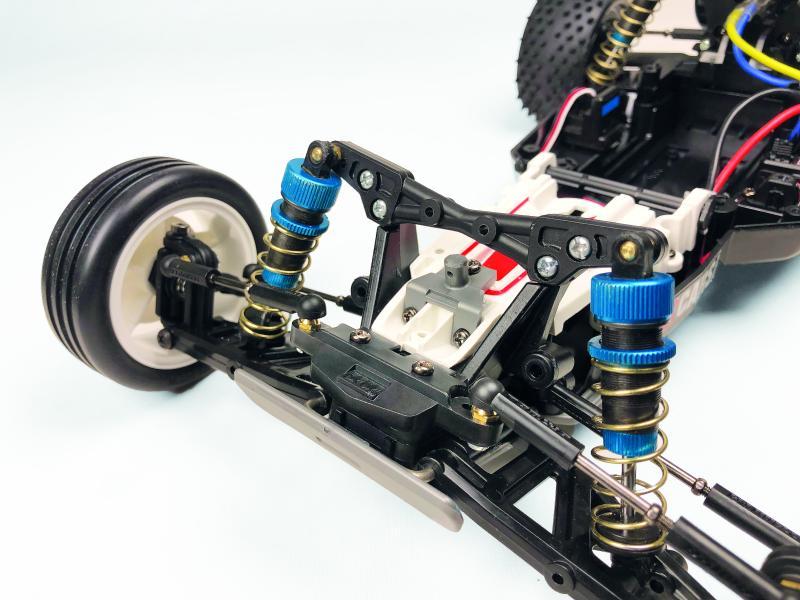The new front axle unit of the DT-04 also incorporates the damper bridge and the CVA oil pressure shock absorbers. The front kick in the DT-04 chassis is 22.5 degrees and ensures a stable caster angle of the front axle.