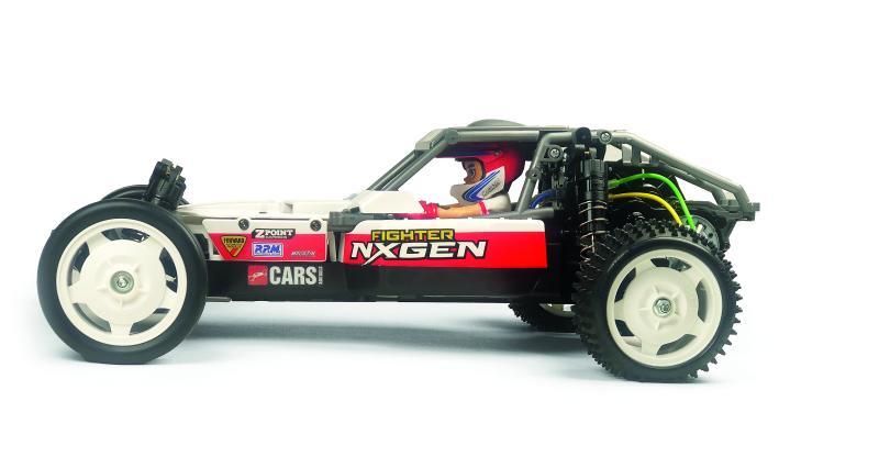The NXGEN comes with two decal color options, red and blue, and a driver figure. The striking body features multiple body panels connected with tubular frames; a design inspired by full-size racing buggies and the BBX buggy. The injection-molded, white body parts are firmly bolted to the sides of the chassis. The middle section can be folded up. You turn the central hood catch, remove the two side cotter pins and then fold the roof up to the rear. If you then push the cool driver figure forwards, you can access the drive battery.