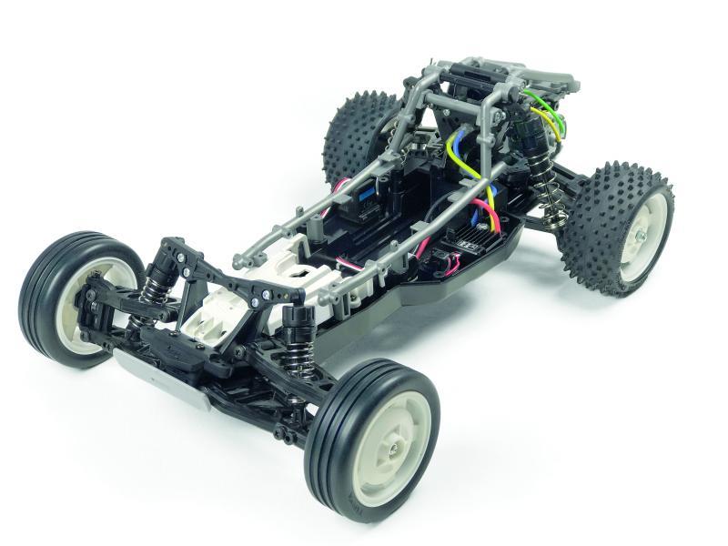 The newly developed DT-04 chassis with rear-wheel drive has a robust tub frame chassis. The chassis has an inline battery position that accommodates both the classic round cell battery and the square LiPo batteries. The speed controller/ESC is mounted on the left and the receiver on the right on the side pontoons. There is sufficient space in front of the drive battery for a standard steering servo, which is connected to the steering with a servo servo horn. At this point, we have opted for the optional version of the High-Tourqe servo saver.